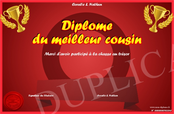 Envoyez par email votre Diplôme du meilleur cousin personalisé