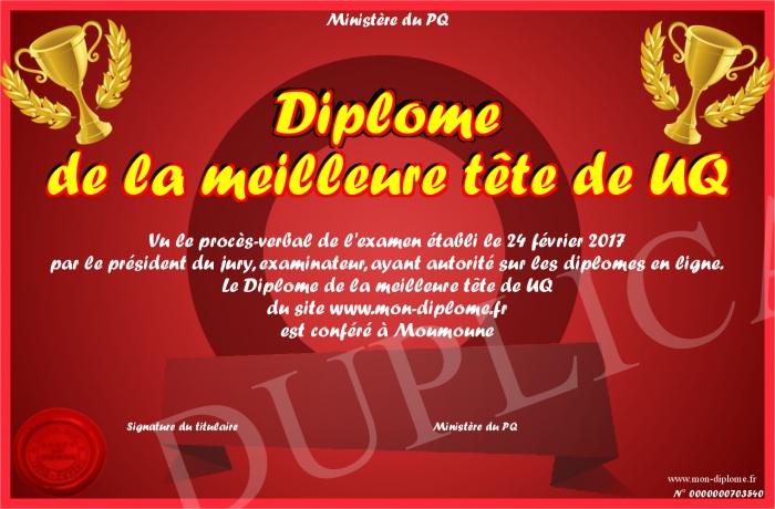 Envoyez par email votre Diplôme de la meilleure tête de UQ personalisé