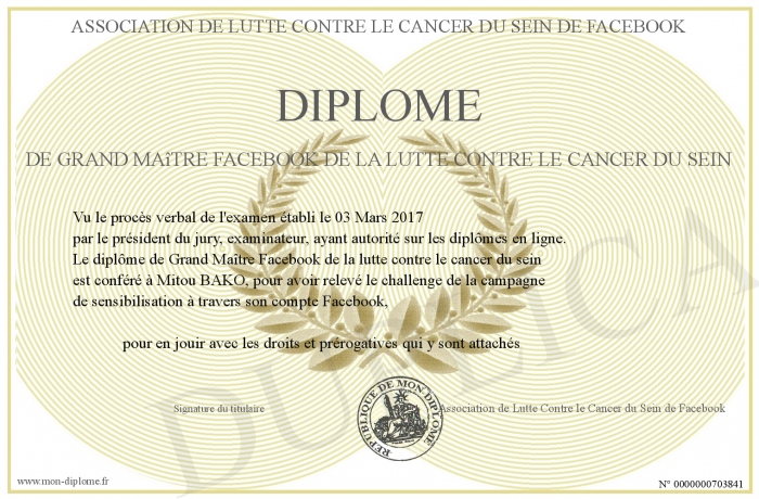 Envoyez par email votre Diplôme de Grand Maître Facebook de la lutte contre le cancer du sein personalisé