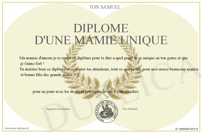 Envoyez par email votre DIPLOME D'UNE MAMIE UNIQUE personalisé