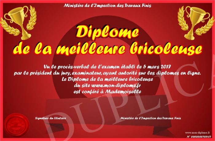 Envoyez par email votre Diplome de la meilleure bricoleuse personalisé
