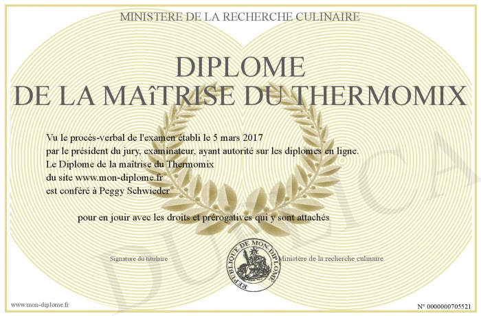 Envoyez par email votre Diplôme de la maîtrise du Thermomix personalisé
