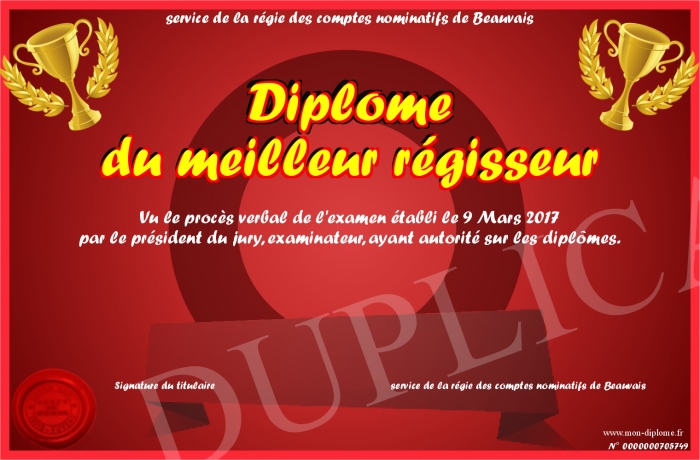 Envoyez par email votre Diplôme du meilleur régisseur personalisé