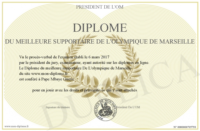 Envoyez par email votre Diplôme du meilleure supportaire De L'olympique de Marseille personalisé