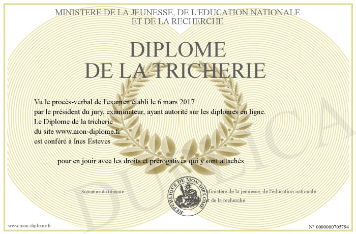 Envoyez par email votre Diplôme de la tricherie personalisé