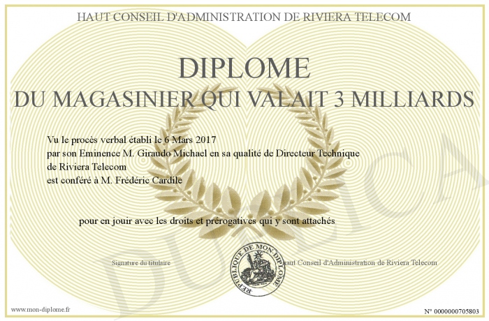 Envoyez par email votre Diplôme du Magasinier qui valait 3 Milliards personalisé