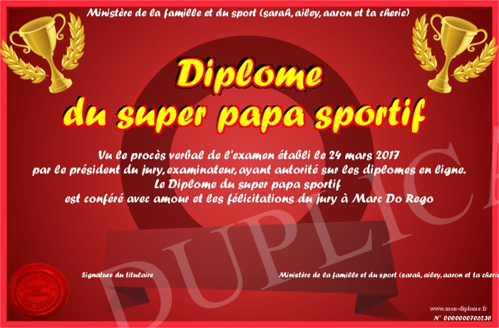 Envoyez par email votre Diplôme du super papa sportif personalisé
