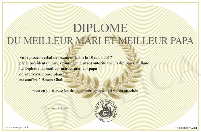 Envoyez par email votre Diplôme du meilleur mari et meilleur papa personalisé