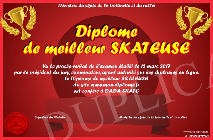 Envoyez par email votre Diplôme de meilleur SKATEUSE personalisé