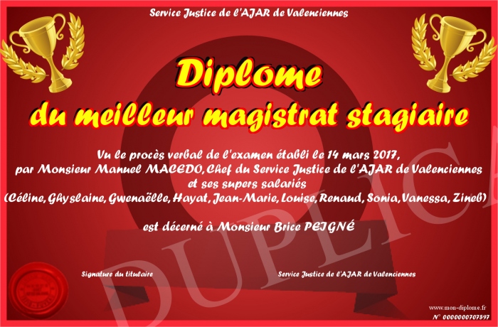 Envoyez par email votre Diplome du meilleur magistrat stagiaire personalisé