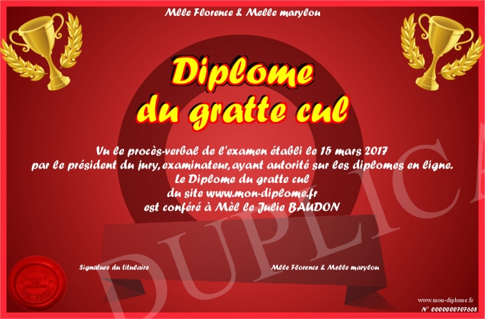 Envoyez par email votre Diplôme du gratte cul personalisé