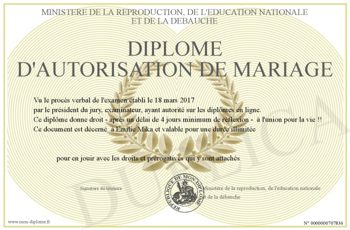 Envoyez par email votre Diplôme d'autorisation de mariage personalisé