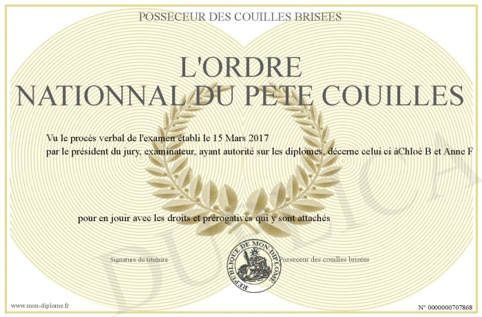Envoyez par email votre L'ordre Nationnal du Pète Couilles personalisé