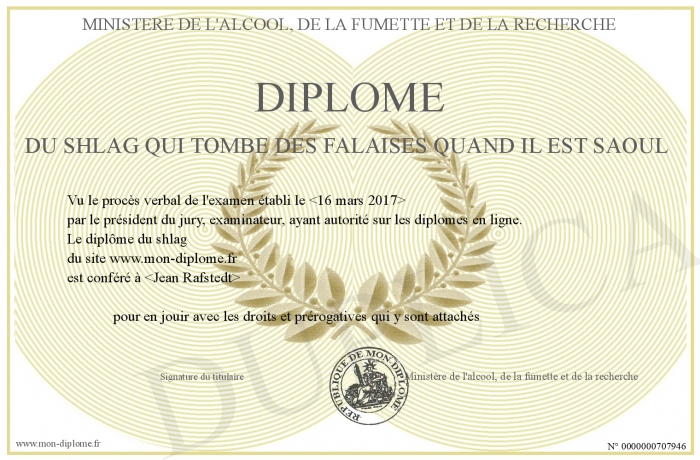 Envoyez par email votre Diplôme du shlag qui tombe des falaises quand il est saoul personalisé