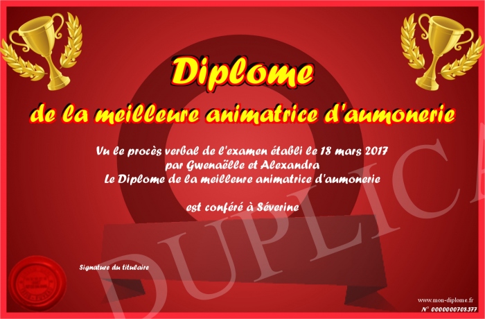 Envoyez par email votre Diplôme de la meilleure animatrice d'aumônerie personalisé