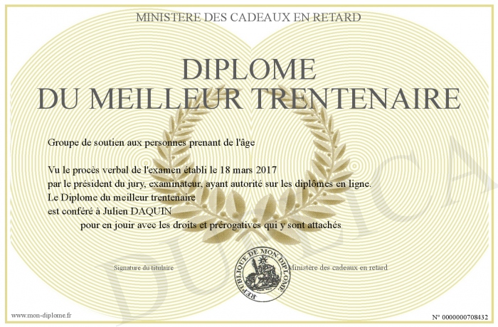 Envoyez par email votre Diplôme du meilleur trentenaire personalisé