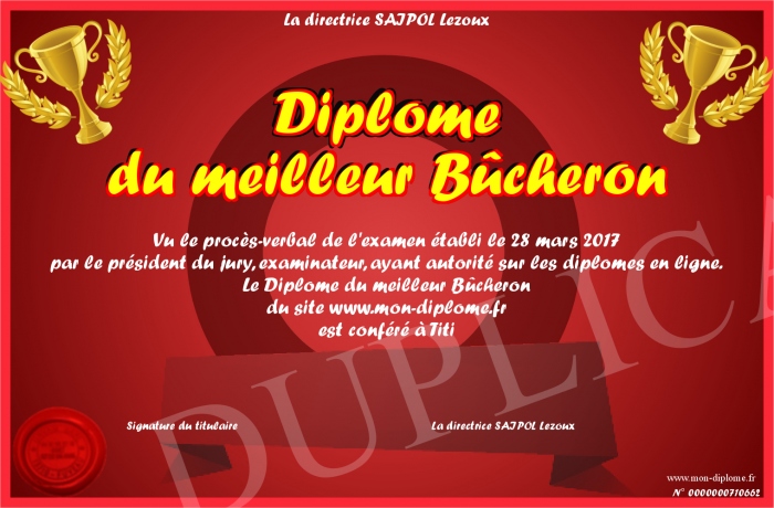Envoyez par email votre Diplôme du meilleur Bûcheron personalisé