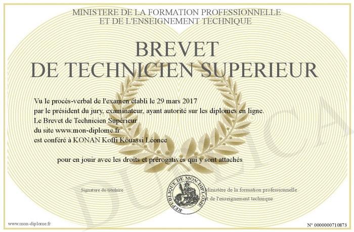 Envoyez par email votre Brevet de Technicien Supérieur personalisé