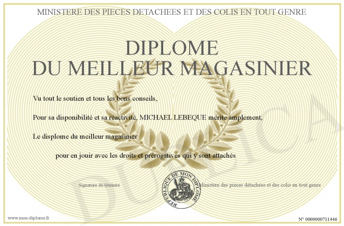 Envoyez par email votre Diplôme du meilleur magasinier personalisé