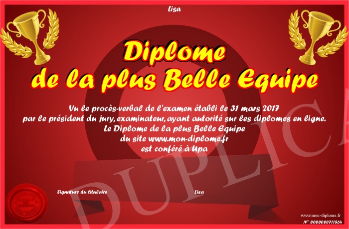 Envoyez par email votre Diplôme de la plus Belle Equipe personalisé