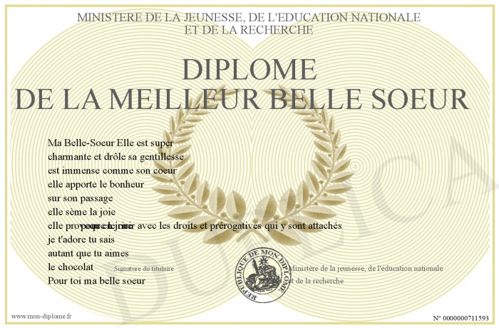 Envoyez par email votre Diplôme DE LA MEILLEUR BELLE SOEUR personalisé