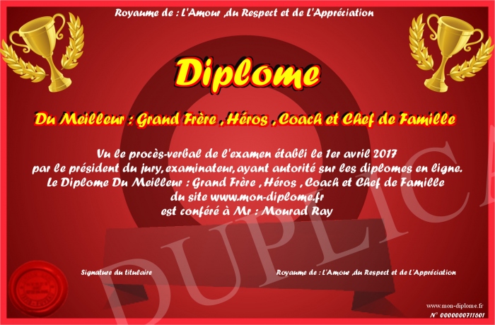 Envoyez par email votre Diplôme Du Meilleur : Grand Frère , Héros , Coach et Chef de Famille personalisé