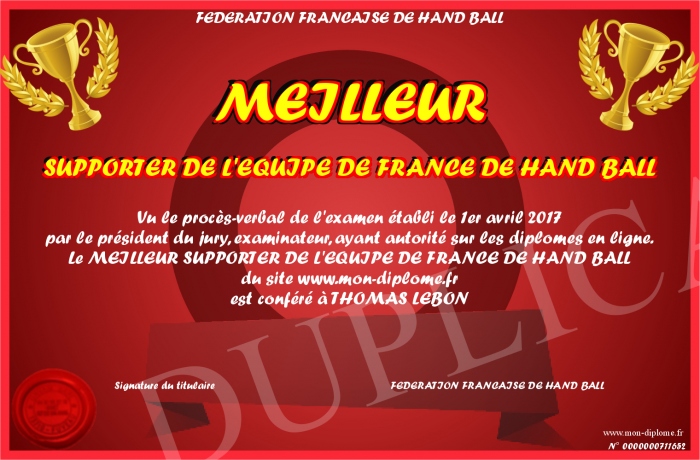 Envoyez par email votre MEILLEUR SUPPORTER DE L'EQUIPE DE FRANCE DE HAND BALL personalisé