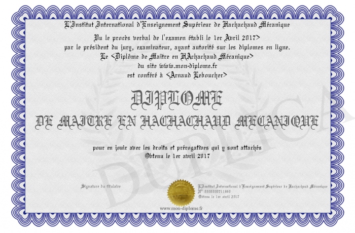 Envoyez par email votre DIPLOME DE MAITRE EN HACHACHAUD MECANIQUE personalisé