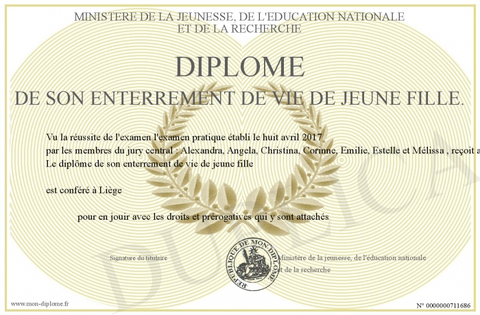 Envoyez par email votre Diplôme de son enterrement de vie de jeune fille. personalisé