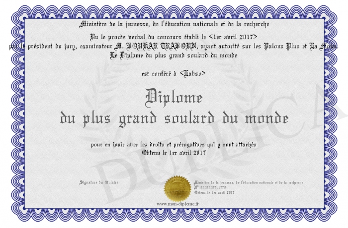 Envoyez par email votre Diplôme du plus grand soulard du monde personalisé
