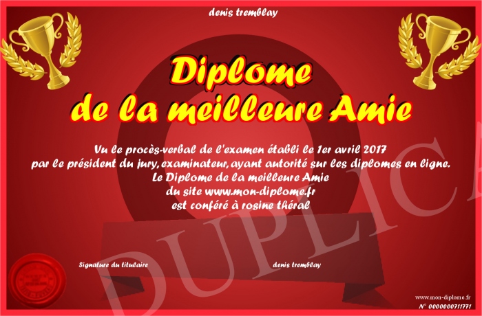 Envoyez par email votre Diplome de la meilleure Amie personalisé