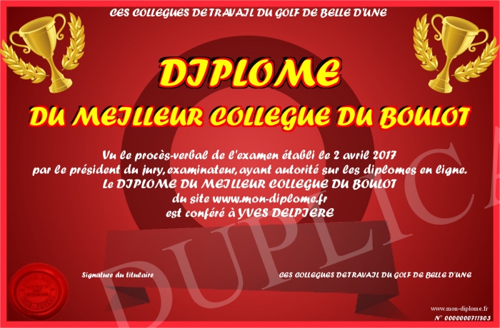 Envoyez par email votre DIPLOME DU MEILLEUR COLLEGUE DU BOULOT personalisé