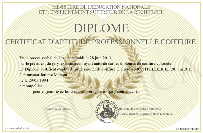 Envoyez par email votre Diplôme certificat d'aptitude professionnelle coiffure personalisé