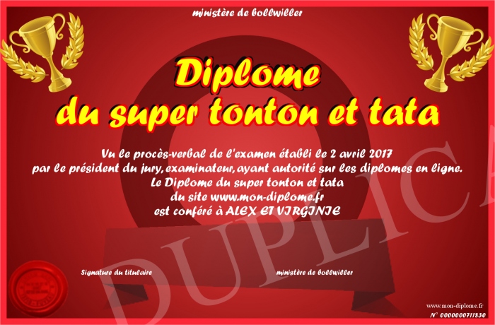 Envoyez par email votre Diplôme du super tonton et tata personalisé