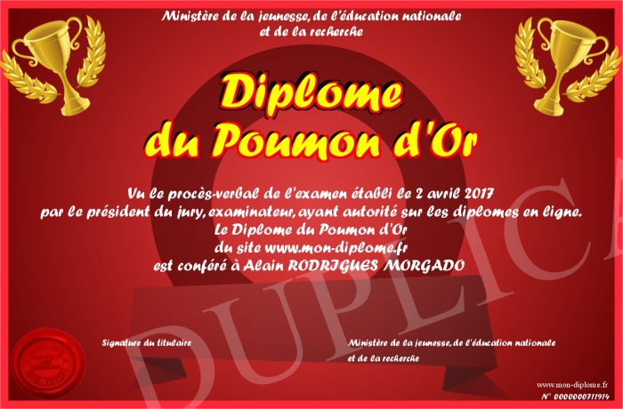 Envoyez par email votre Diplôme du Poumon d'Or personalisé