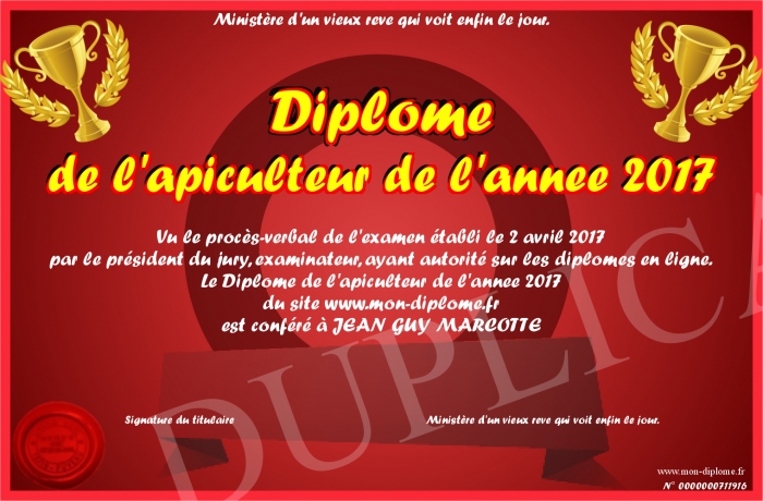 Envoyez par email votre Diplôme de l'apiculteur de l'annee 2017 personalisé