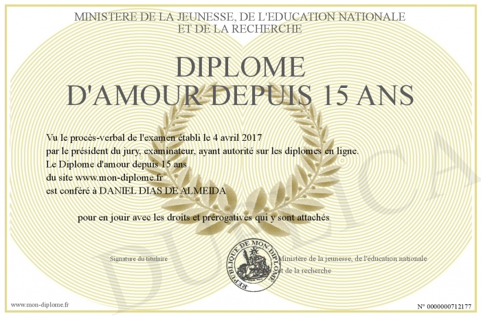 Envoyez par email votre Diplôme d'amour depuis 15 ans personalisé
