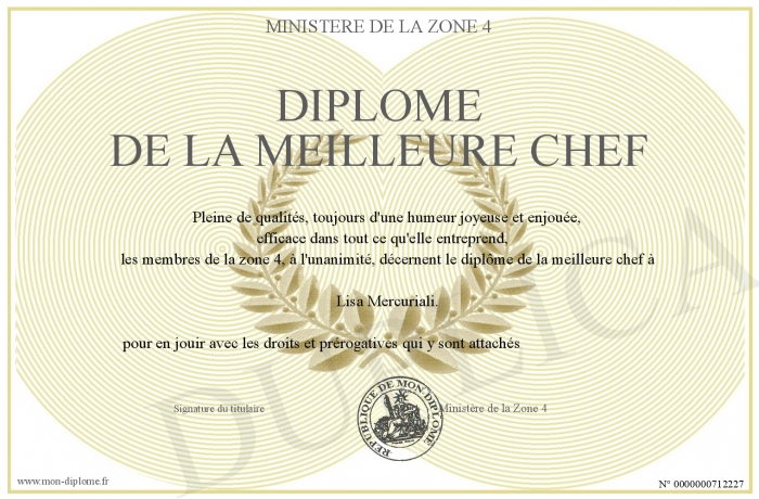 Envoyez par email votre Diplôme de la meilleure chef personalisé