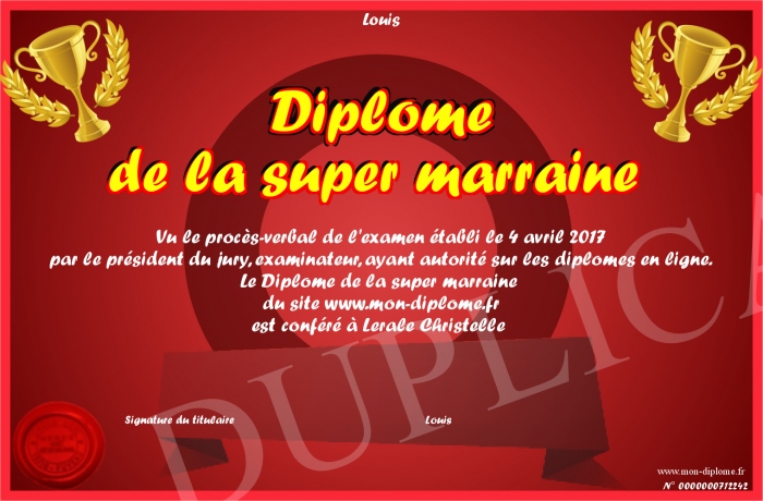 Envoyez par email votre Diplôme de la super marraine personalisé