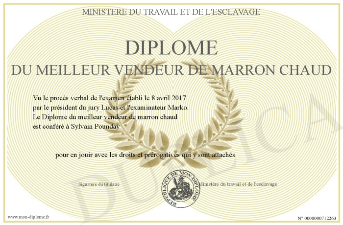 Envoyez par email votre Diplôme du meilleur vendeur de marron chaud personalisé