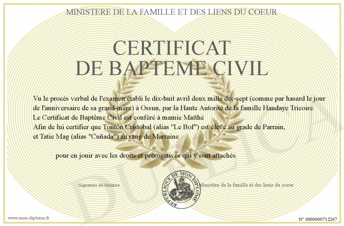 Envoyez par email votre Certificat de Bapteme Civil personalisé