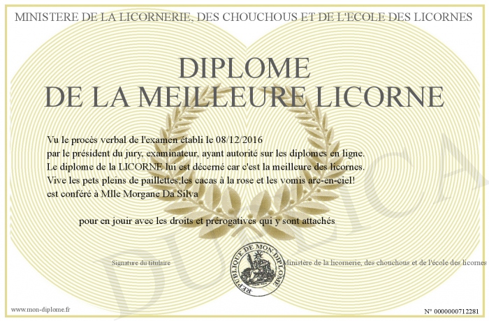Envoyez par email votre Diplôme de la meilleure Licorne personalisé