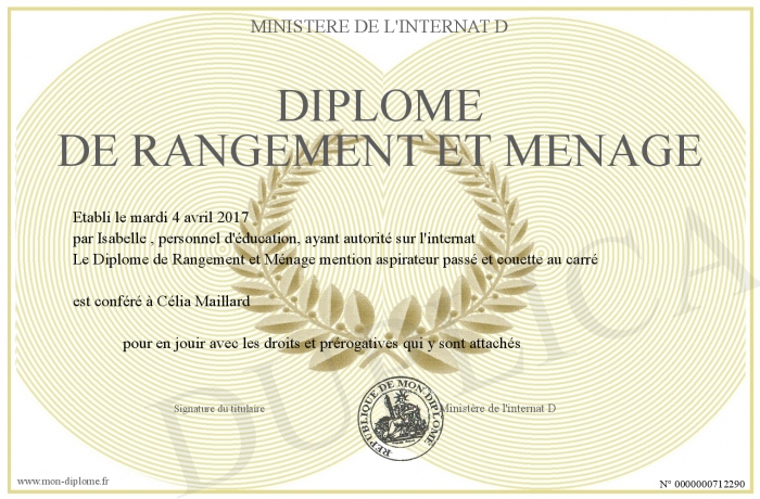 Envoyez par email votre Diplôme de Rangement et Ménage personalisé