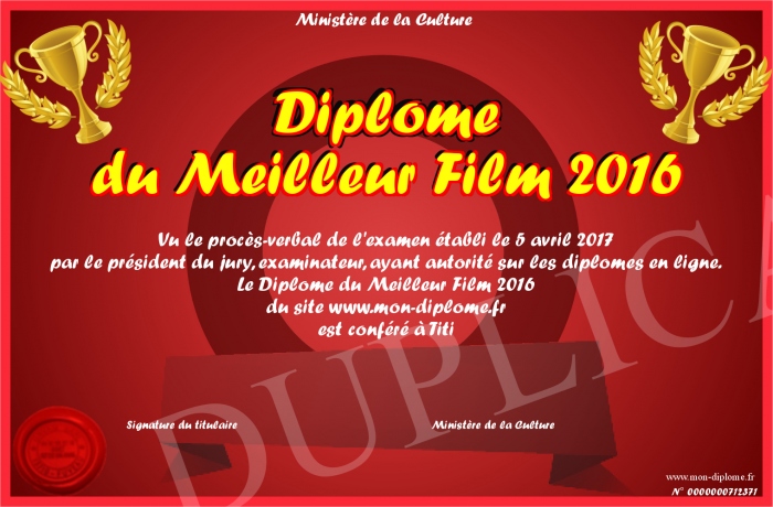 Envoyez par email votre Diplôme du Meilleur Film 2016 personalisé