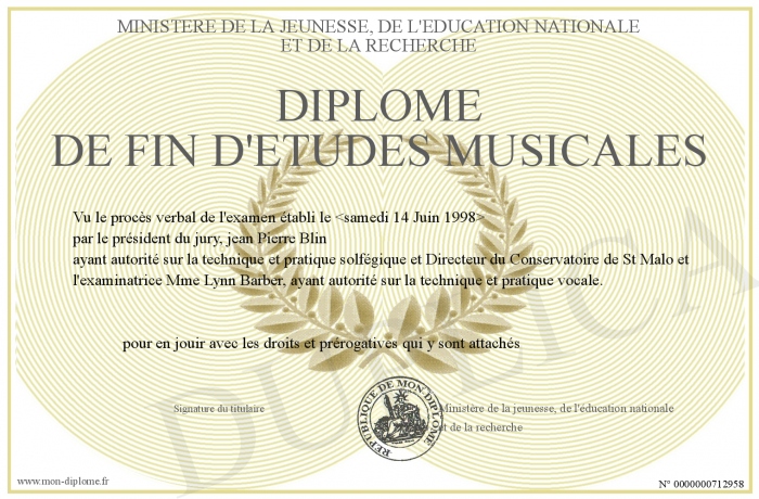 Envoyez par email votre Diplôme de fin d'études musicales personalisé