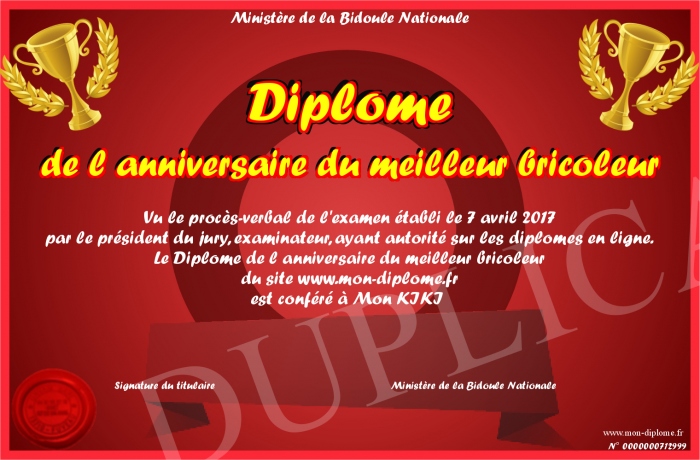 Envoyez par email votre Diplôme de l anniversaire du meilleur bricoleur personalisé