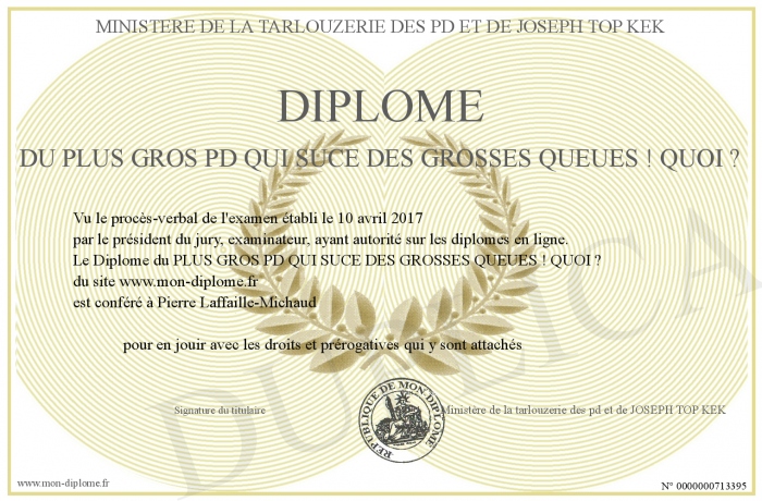 Envoyez par email votre Diplôme du PLUS GROS PD QUI SUCE DES GROSSES QUEUES ! QUOI ? personalisé