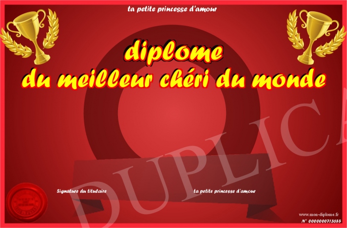 Envoyez par email votre diplôme du meilleur chéri du monde personalisé