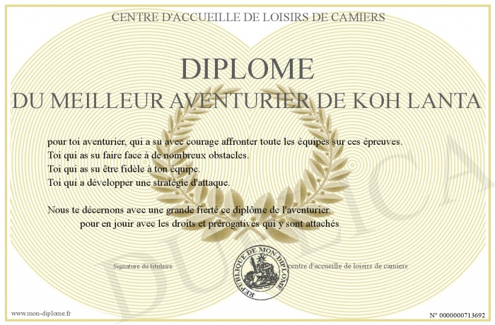 Envoyez par email votre Diplôme du meilleur aventurier de koh lanta personalisé