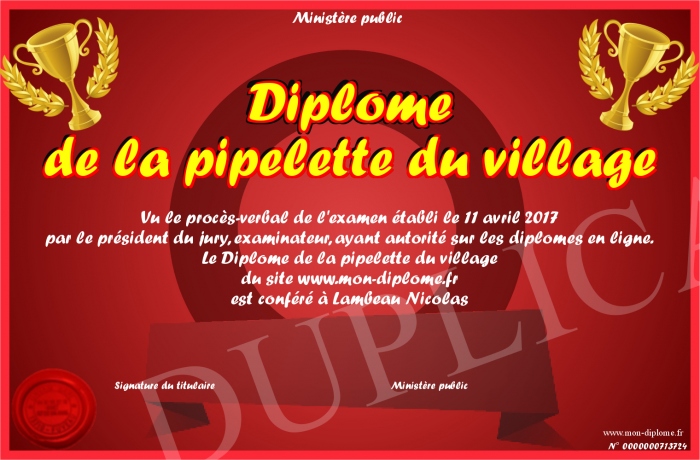 Envoyez par email votre Diplôme de la pipelette du village personalisé